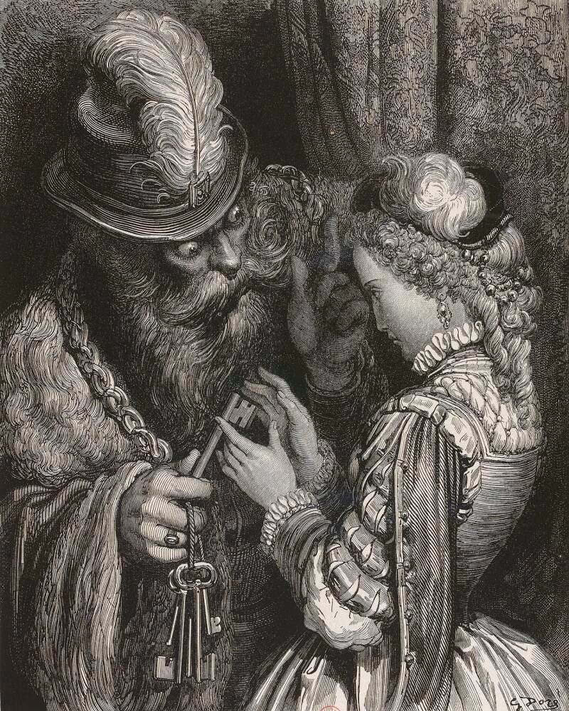 Le lendemain, il lui demanda les clefs ; et elle les lui donna, mais d’une main si tremblante, qu’il devina sans peine tout ce qui s’était passé. « D’où vient, lui dit-il, que la clef du cabinet n’est point avec les autres ? — Il faut, dit-elle, que je l’aie laissée là-haut sur ma table. — Ne manquez pas, dit la Barbe-Bleue, de me la donner tantôt. »